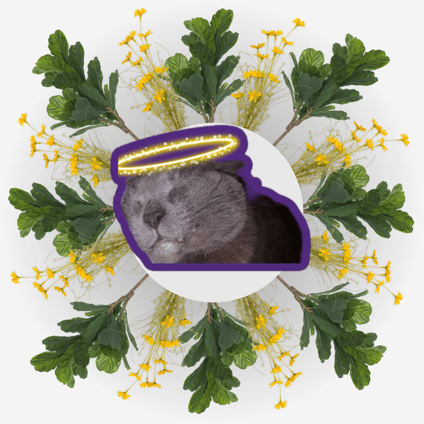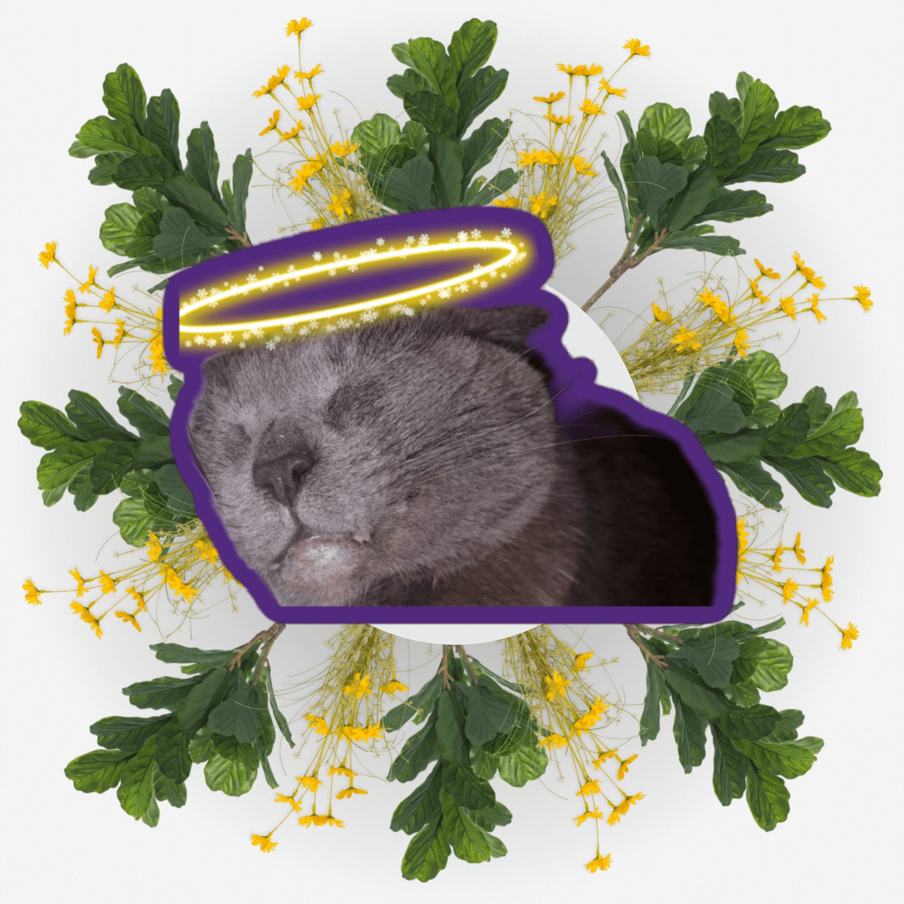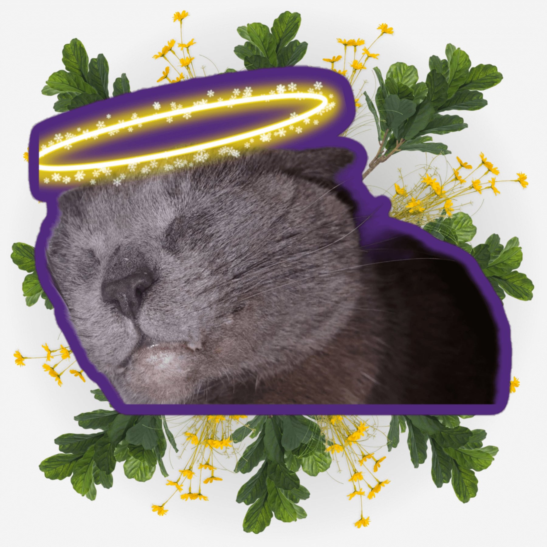 Sleeping Angel sticker featuring a cat face with a halo and floral background, symbolizing love and remembrance.