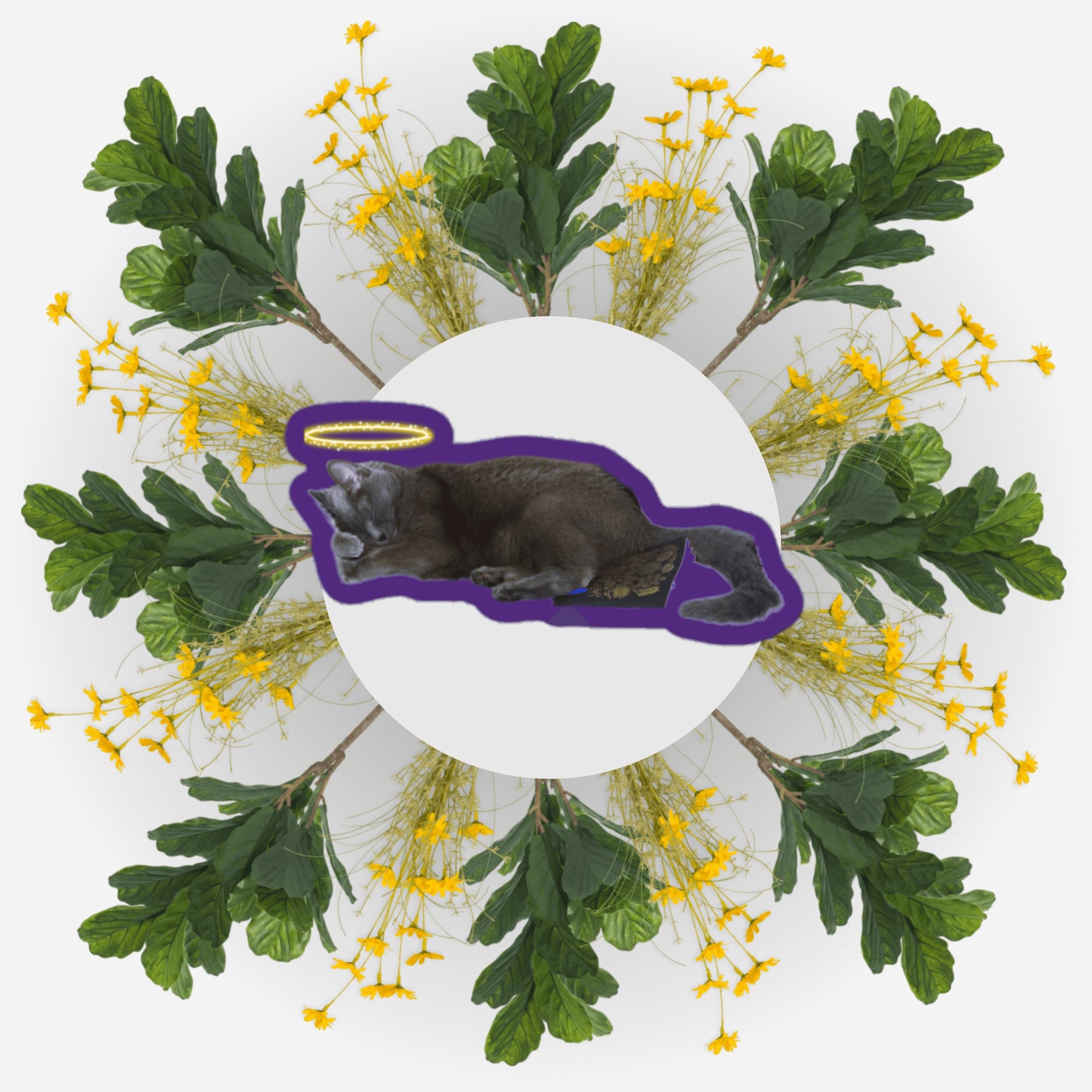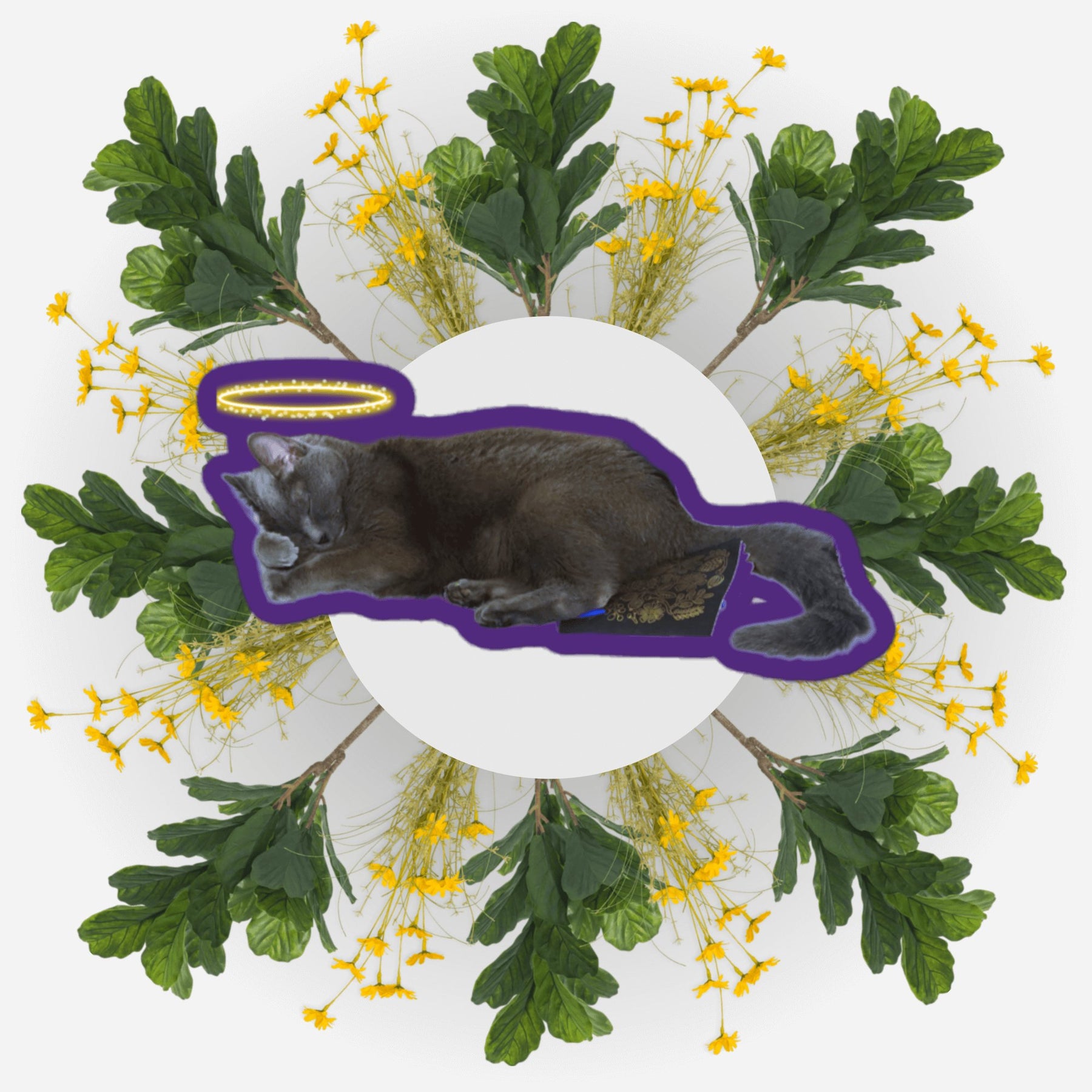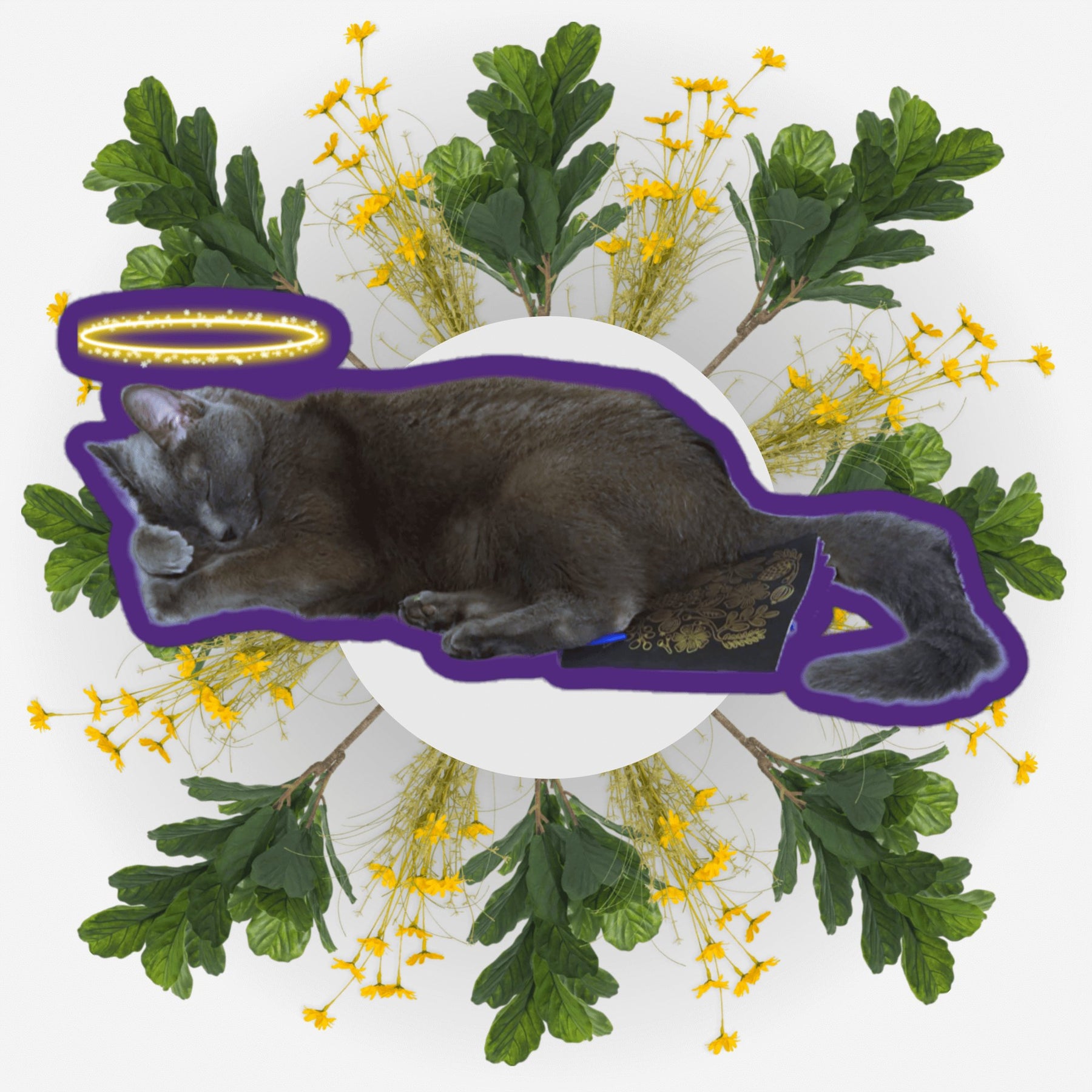 Sleeping Angel Ver. 2 featuring a cat with a halo surrounded by flowers and leaves.